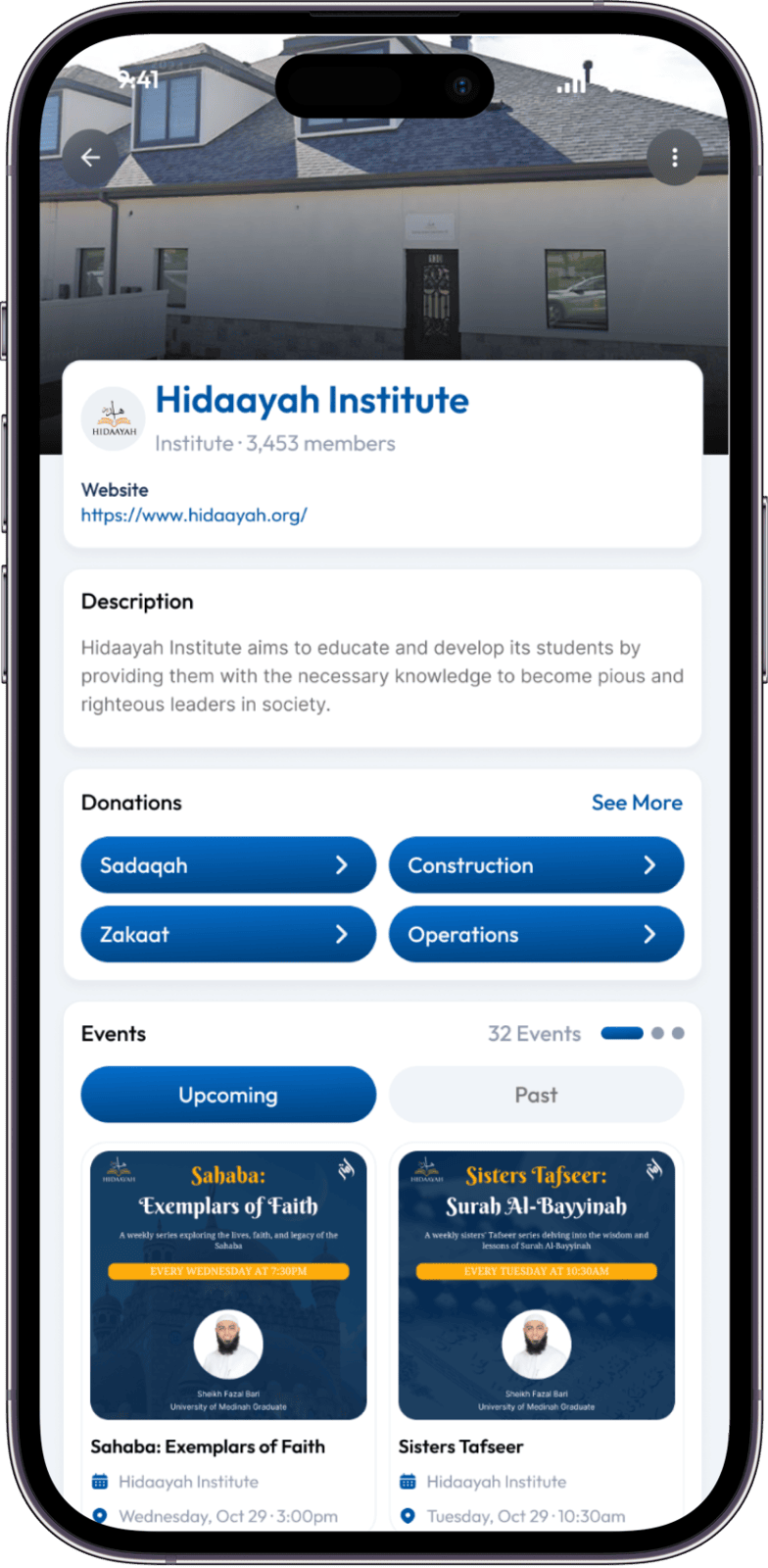 Easily manage your sustaining membership, donate to operations (Sadaqah), or contribute towards construction and Zakat directly through the app.